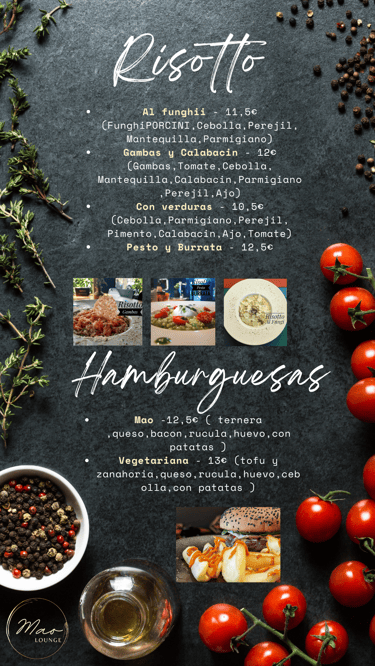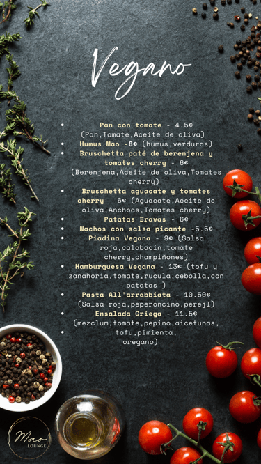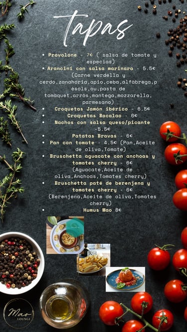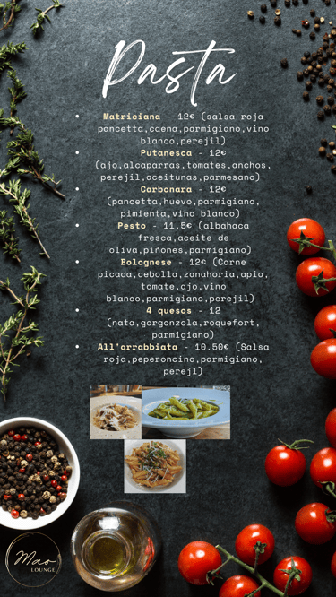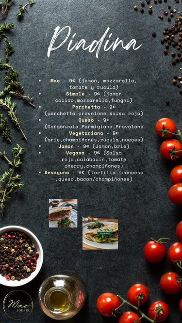 Nuestro menú en Mao Lounge es una deliciosa fusión de sabores que incluye una variedad tentadora de tapas, piadinas italianas, pasta y risotto preparados con ingredientes frescos y de calidad. Para culminar tu experiencia gastronómica, no te pierdas nuestros exquisitos postres que te deleitarán con cada bocado.Descubre una experiencia culinaria inolvidable en Mao Lounge!