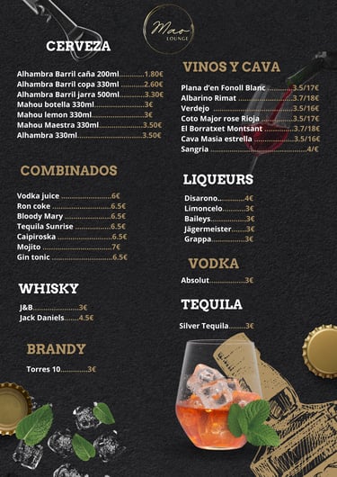 ¡Bienvenido a Mao Lounge en la Rambla de la Pau 65, Vilanova i la Geltrú! Sumérgete en una experiencia gastronómica y musical única en un ambiente acogedor y sofisticado. Disfruta de nuestra deliciosa cocina, que combina sabores internacionales con un toque innovador. Además, déjate cautivar por la vibrante atmósfera mientras disfrutas de música en vivo de talentosos artistas locales. En Mao Lounge, nos esforzamos por brindarte un servicio excepcional y una experiencia inolvidable. Ya sea que estés buscando disfrutar de una cena íntima o celebrar una ocasión especial, te esperamos para compartir momentos memorables en Mao Lounge.